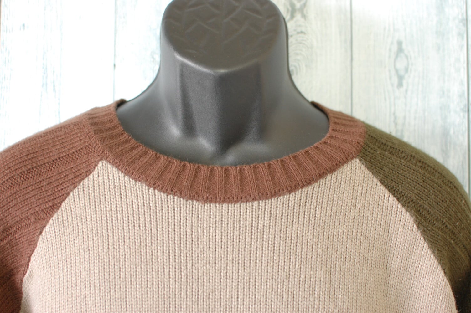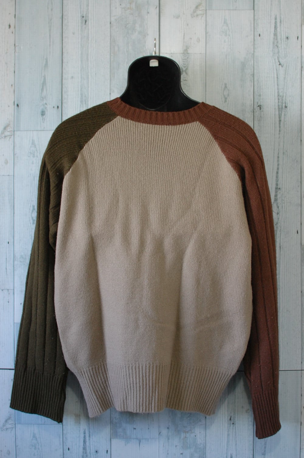 おしゃれなラグラン袖のセーターです。左右で袖の色が異なる個性的なセーターはおしゃれなあなたにぴったりです。サイズ表記はLサイズです。