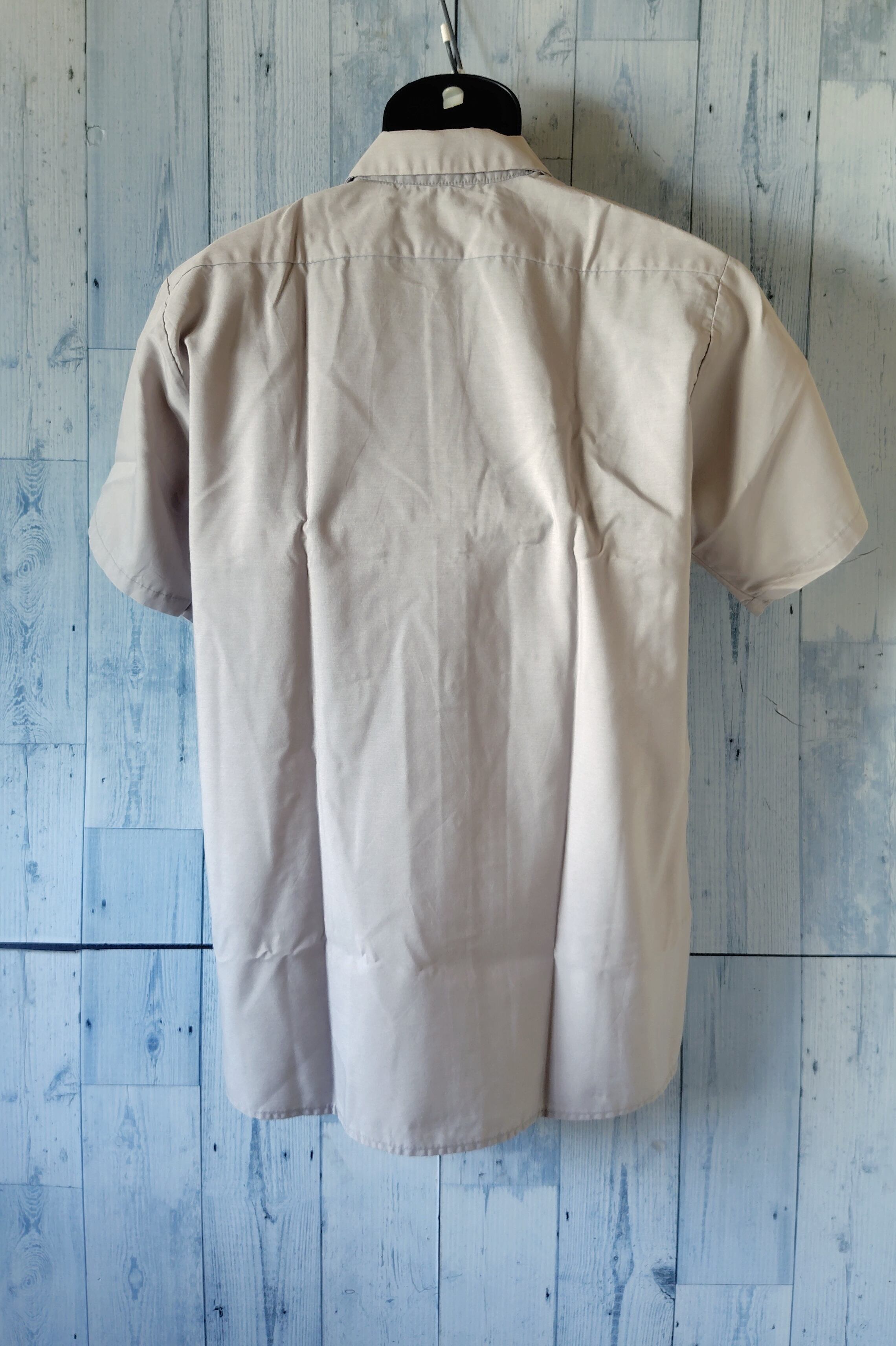 ポリエステル80%、コットン20%の薄手のワークシャツです。アメリカ製。一番上のボタンのみスナップボタンになっております。