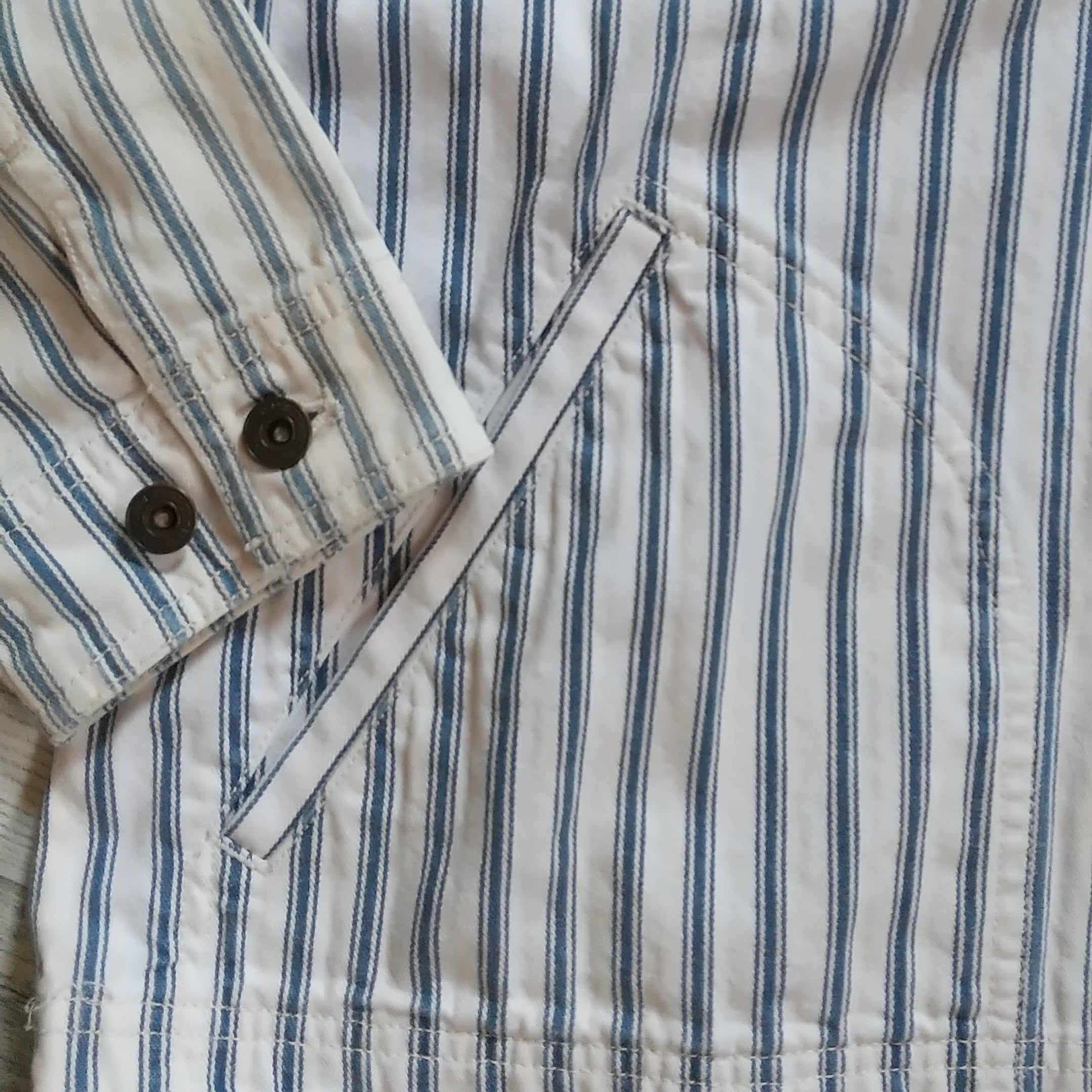 マリンストライプ柄と丈夫な構造で普段着に最適なジャケットは、構造化されたカットと機能的なポケットで実用性を兼ね備えています。